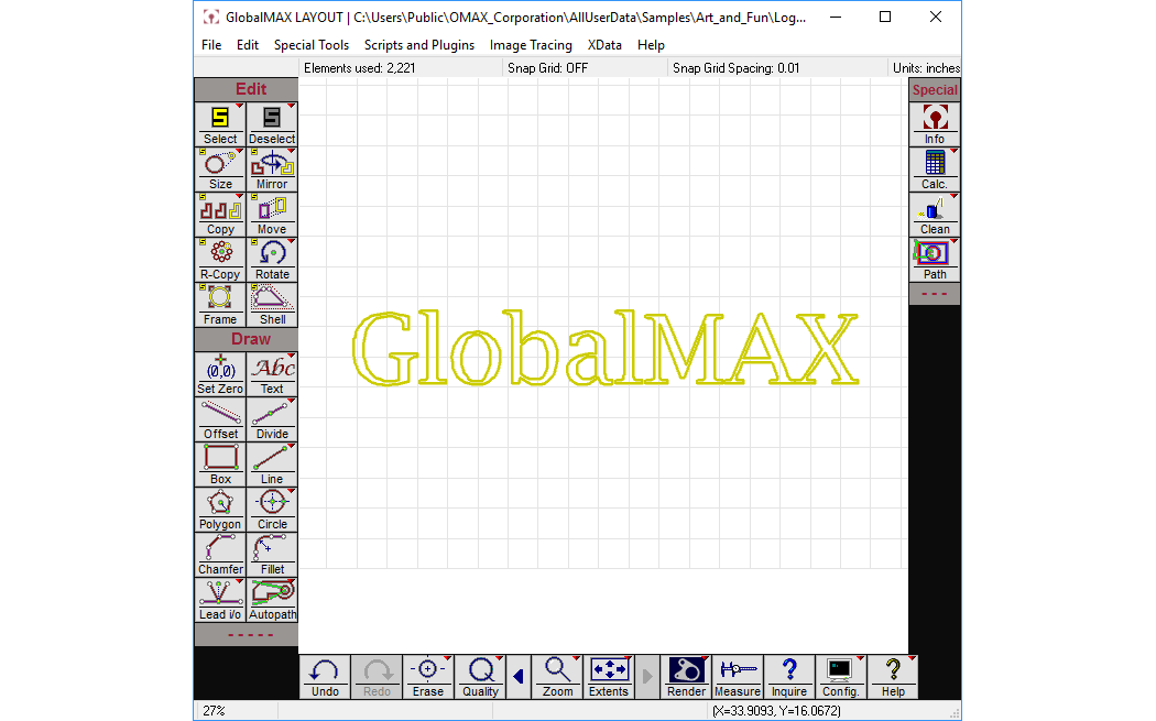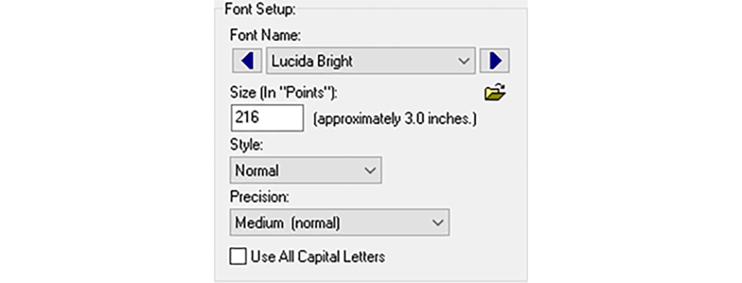 Letters are added as entities, so the font does not need to be installed on the system used to run the GlobalMAX abrasivejet. Once text is added, however, it cannot be "edited" as text (although you can select and erase it and add other text). After text is added to a drawing, all the LAYOUT commands may be used on it (such as Copy, Move, and Size).