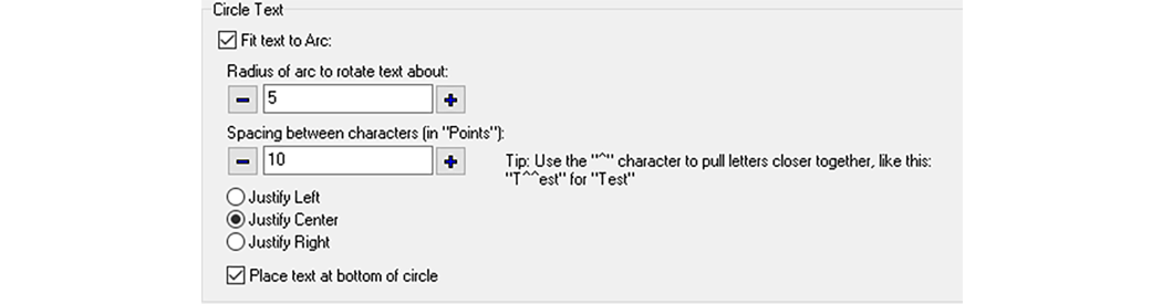 You enter text as you would regularly. The only difference is that you can adjust the spacing between the letters by using the carat (^) character. When the letters are spaced around a circle, some of them may be too far apart. Each carat you type moves the characters closer together. In typography, this is called kerning.