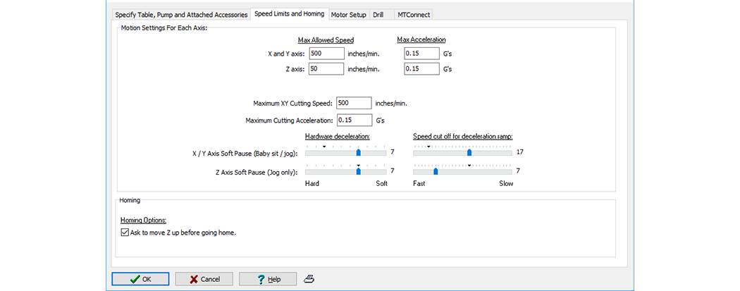 The Speed Limits and Homing options affect the motors that move the machining head.
