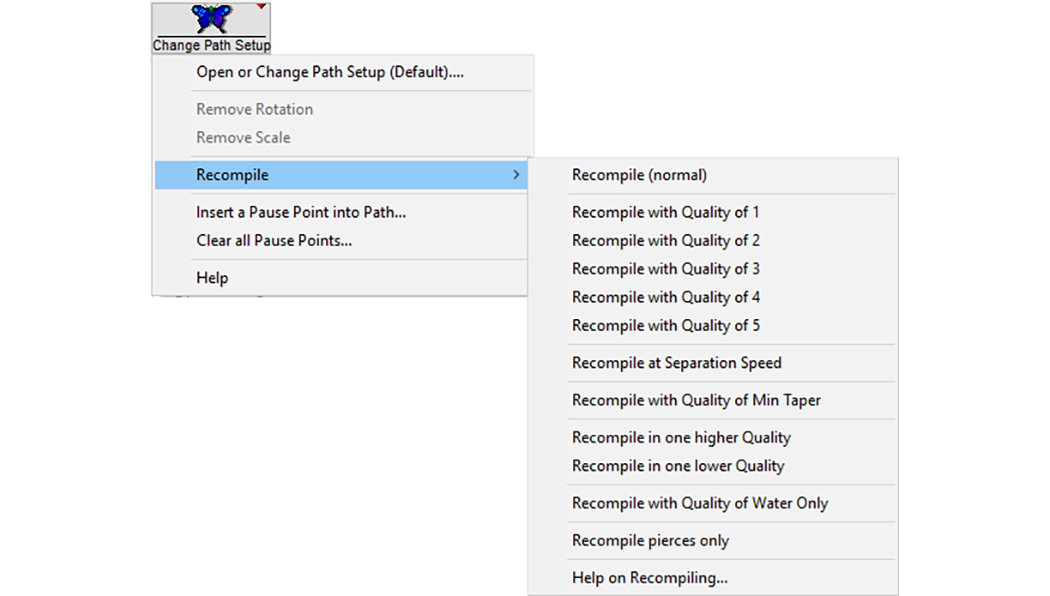 NOTE: When “recompiling” in another quality, only the cutting qualities are changed (Qualities 1,2,3,4, and 5). Minimum taper, etches, scribes, water only, and other qualities are kept the same. If you need to make changes other than what is supported by the “recompile” command, use OMAX LAYOUT or a similar program.