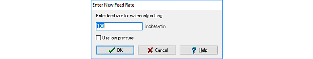 The feed rate is the constant speed you want the nozzle to move at along your tool path. The speed of the nozzle will not be adjusted for the geometry of your part. This feature is useful when working with very thin or soft materials that can be easily pierced with just water.