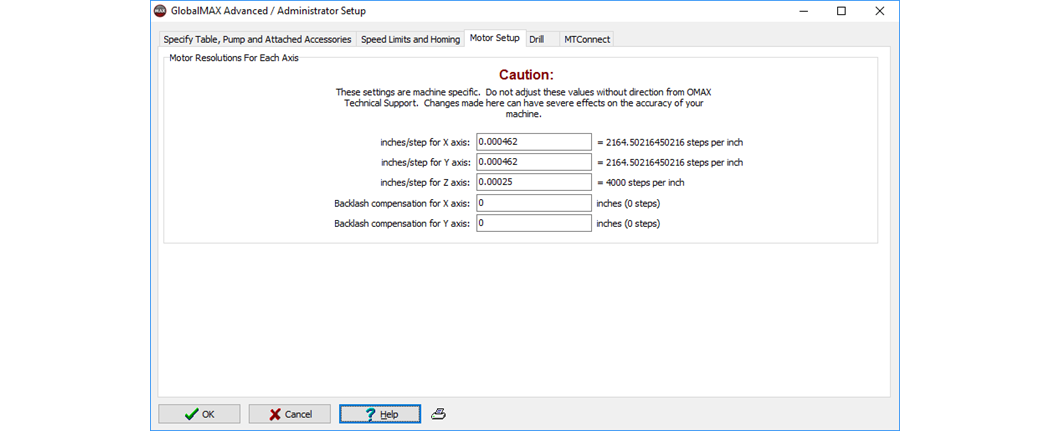 Changing these settings to incorrect values can severely degrade the accuracy of your machine. You should only change these settings under the direction of OMAX Technical Support.