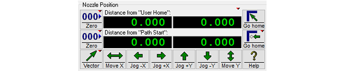 The upper right portion of the MAKE window contains the Nozzle Position controls. These controls move the machining nozzle, and also display its current position. The nozzle’s position is displayed relative to its "home" position, a coordinate you can set.