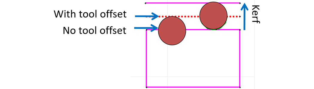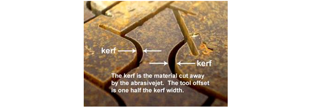 Offset is the distance the nozzle is shifted away from the geometry to compensate for the width of the jet stream. The offset normally equals half of the width of the kerf (e.g., 0.015 in. when kerf is 0.030 in.).
